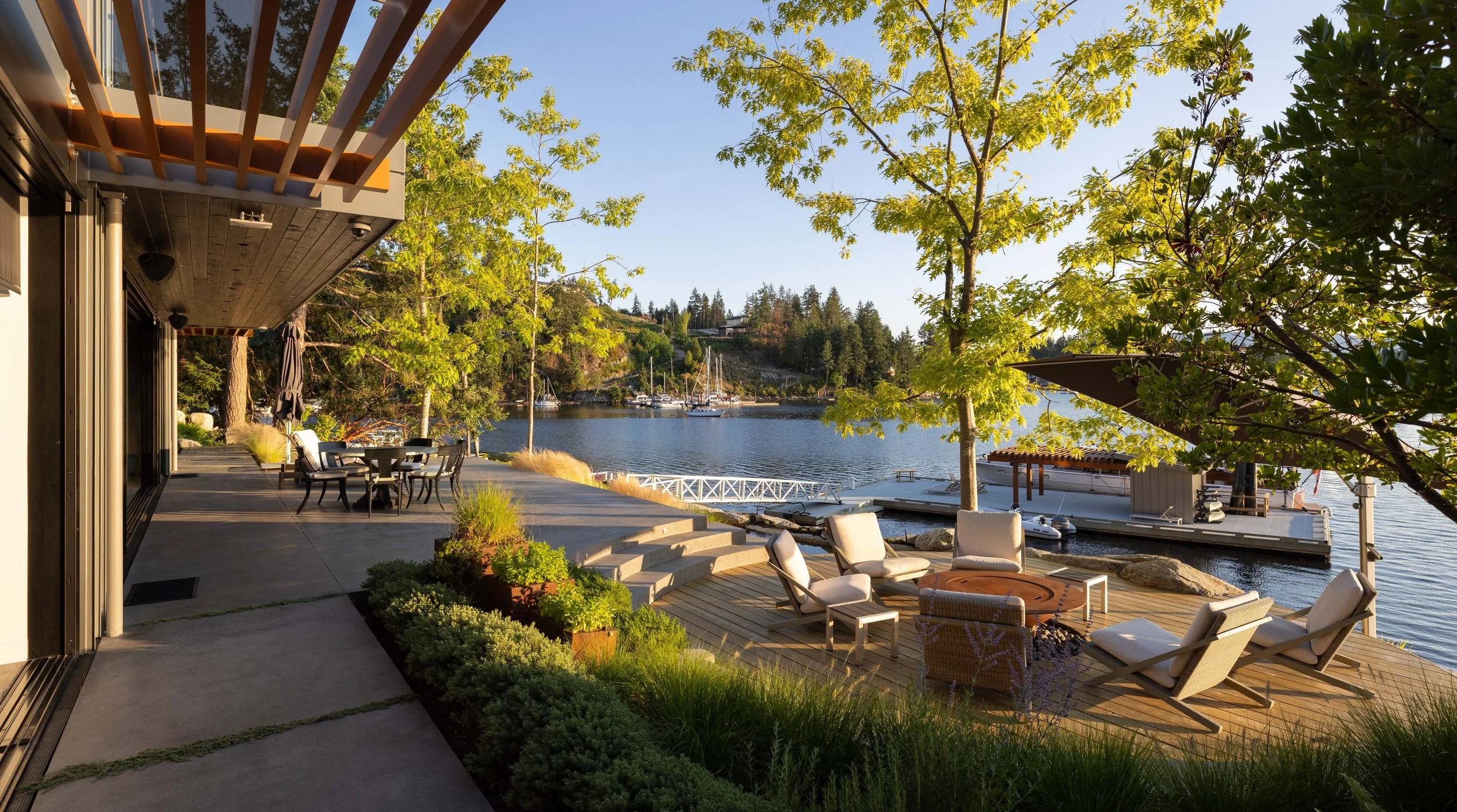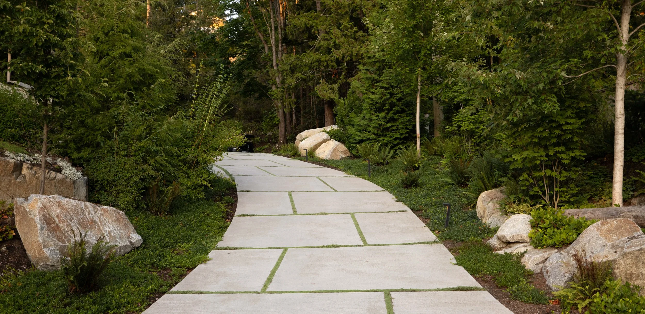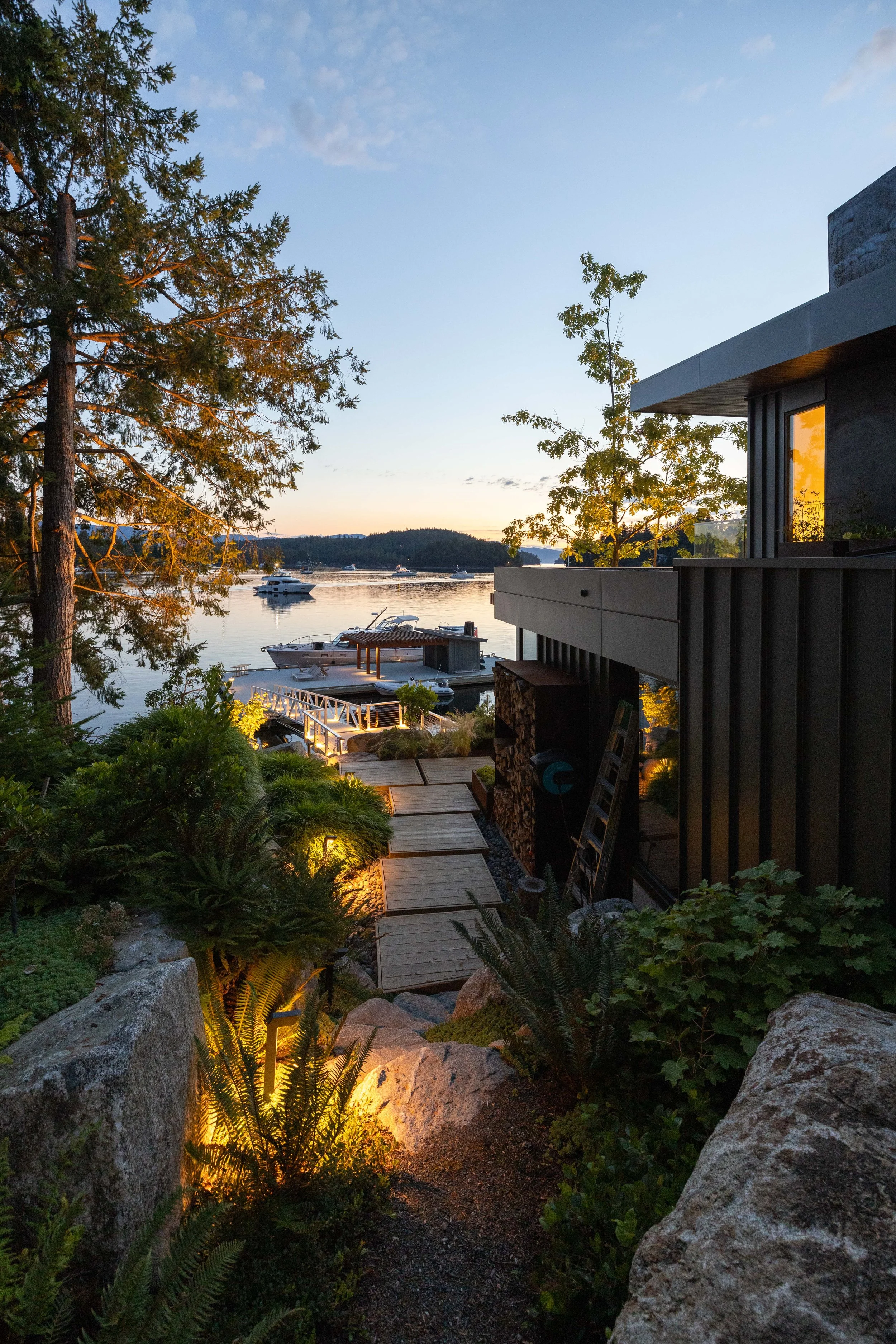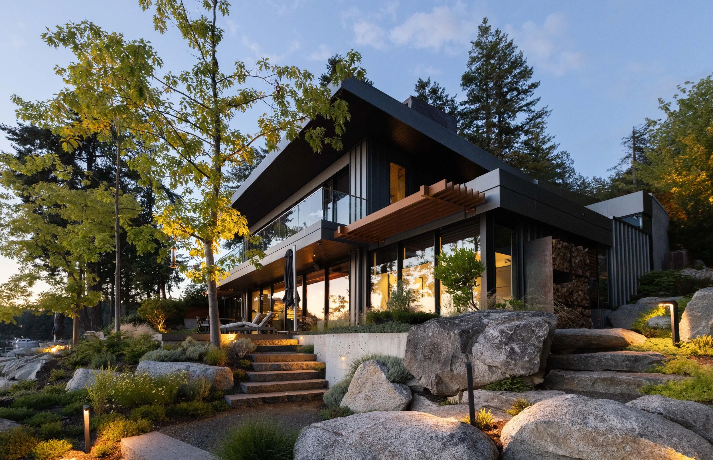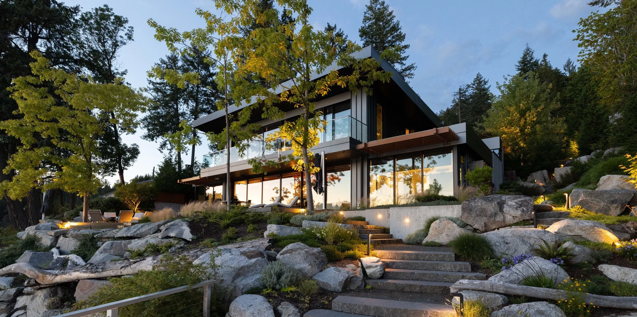 “We had the pleasure of witnessing Dale build an extraordinary piece of art out of a plot of land stripped bare. His vision in creating a tableau using rocks, plants, water, light, concrete, and wood came together like a series of paintings. Every sightline from the house and on the land is like walking through an endless gallery of one masterpiece to another..” - L.D., Sunshine Coast, BC